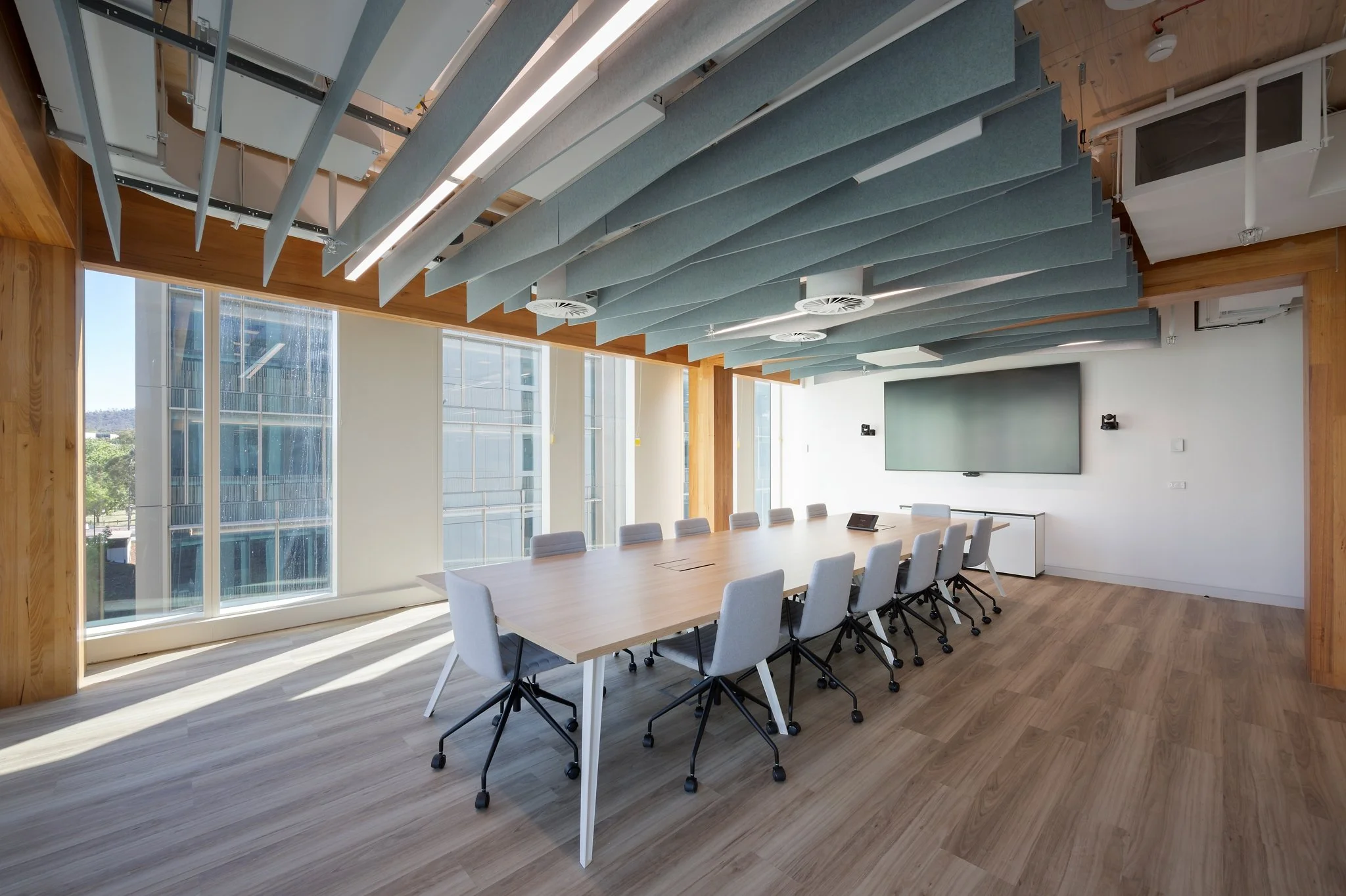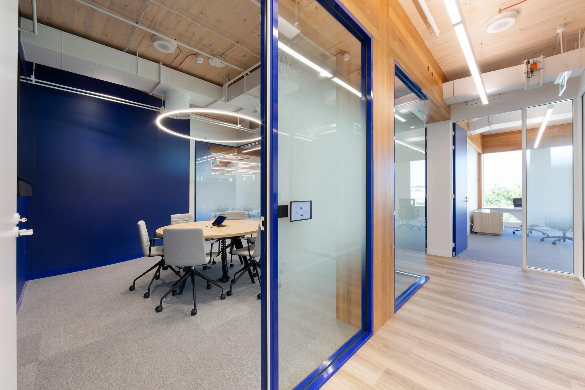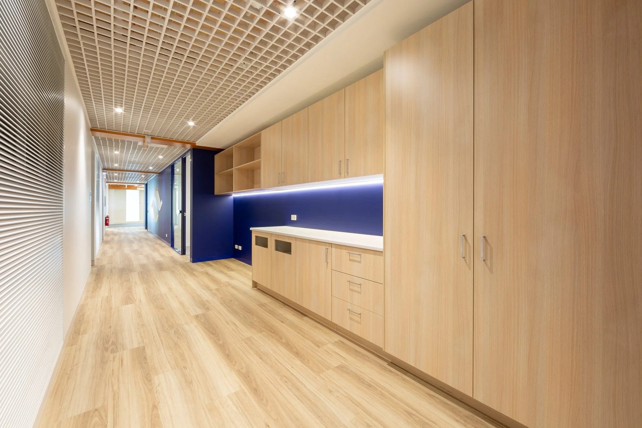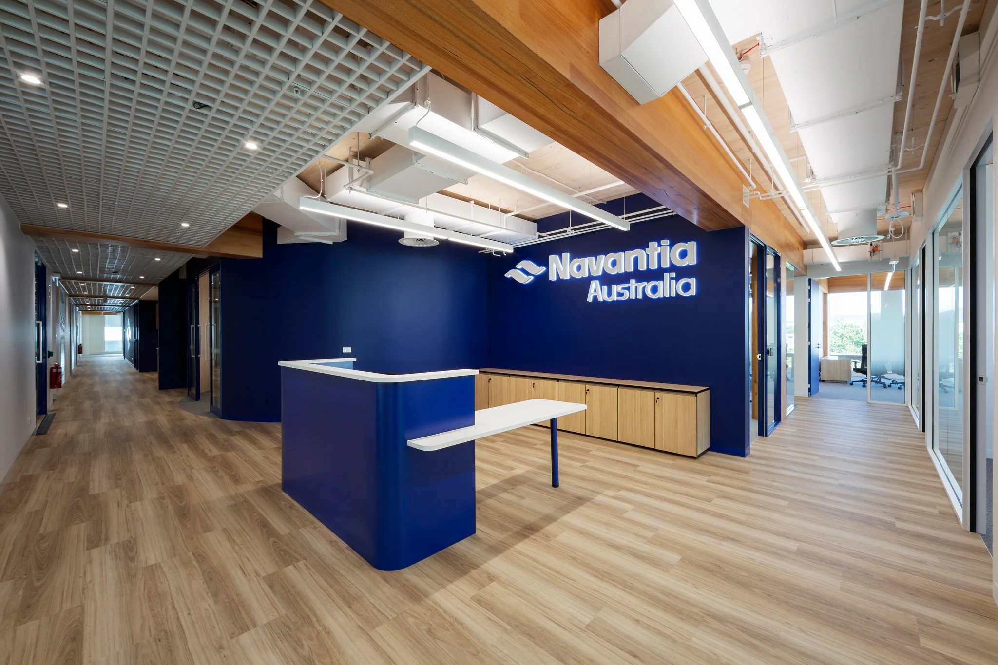 Generous glazing introduces natural light throughout the tenancy, enhancing the open-plan work areas and meeting rooms. A mix of enclosed offices, collaborative spaces, training and showroom areas, and formal boardroom facilities provide flexibility while maintaining a cohesive material palette of timber, soft grey finishes and Navantia’s signature blue.