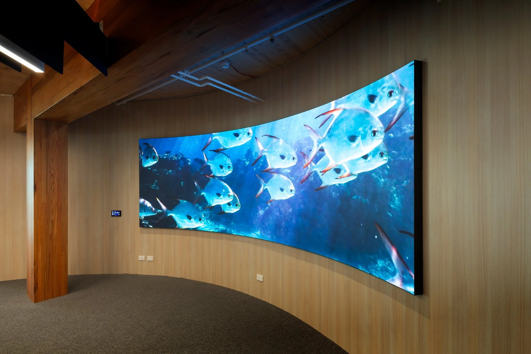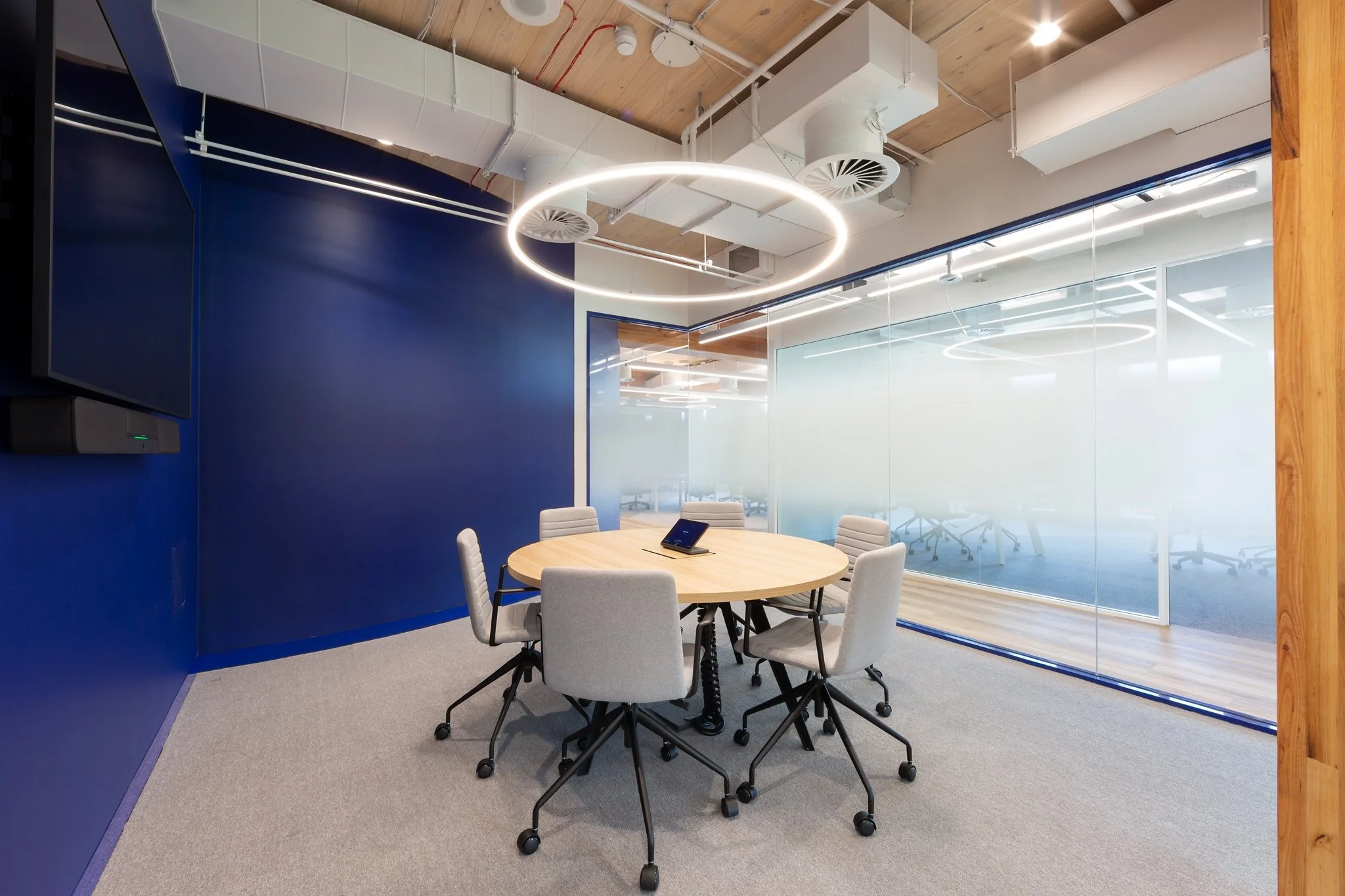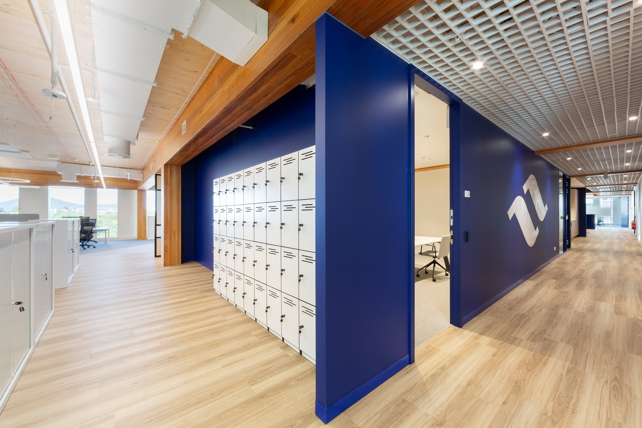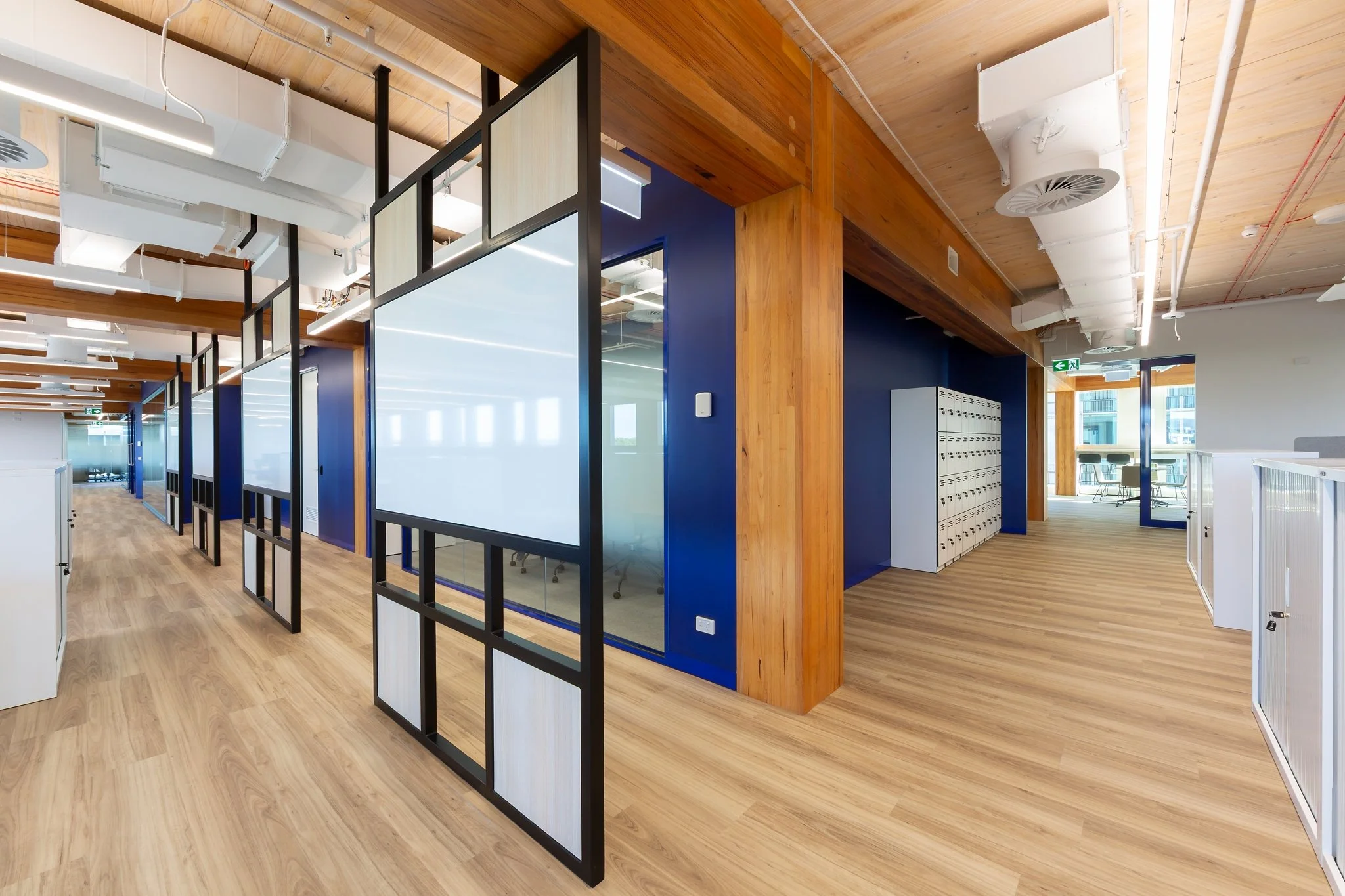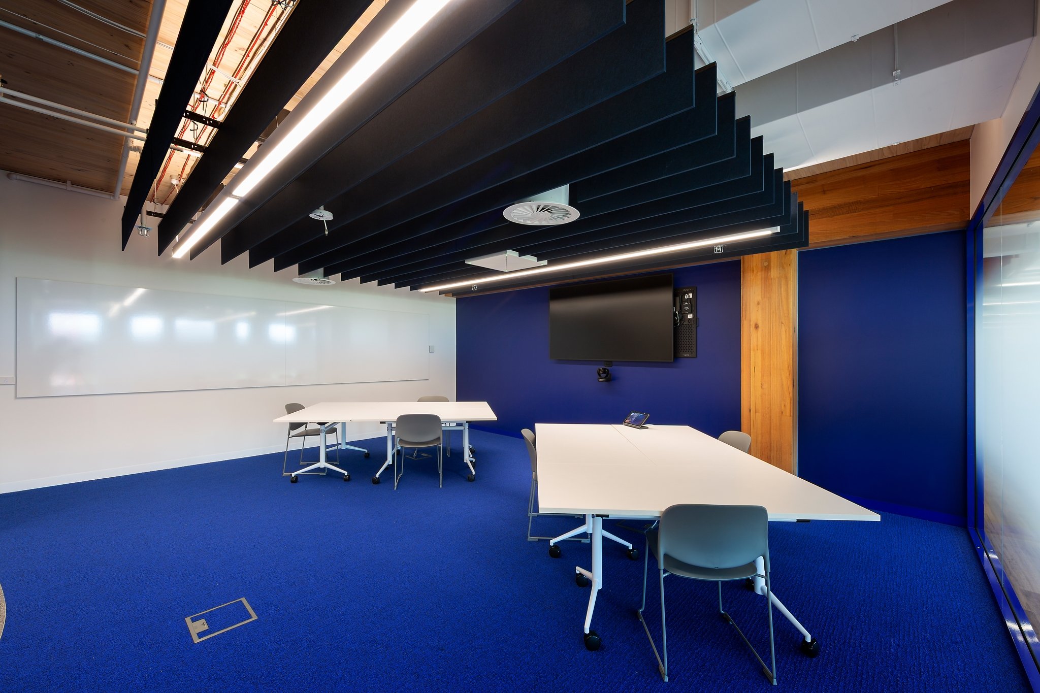 The arrival experience is anchored by a bold navy feature wall and custom reception desk, complemented by integrated timber joinery and clean-lined detailing. Exposed services and linear lighting are balanced with the building’s exposed cross laminated timber (CLT) structure and acoustic treatments, creating visual depth while maintaining acoustic performance and comfort.