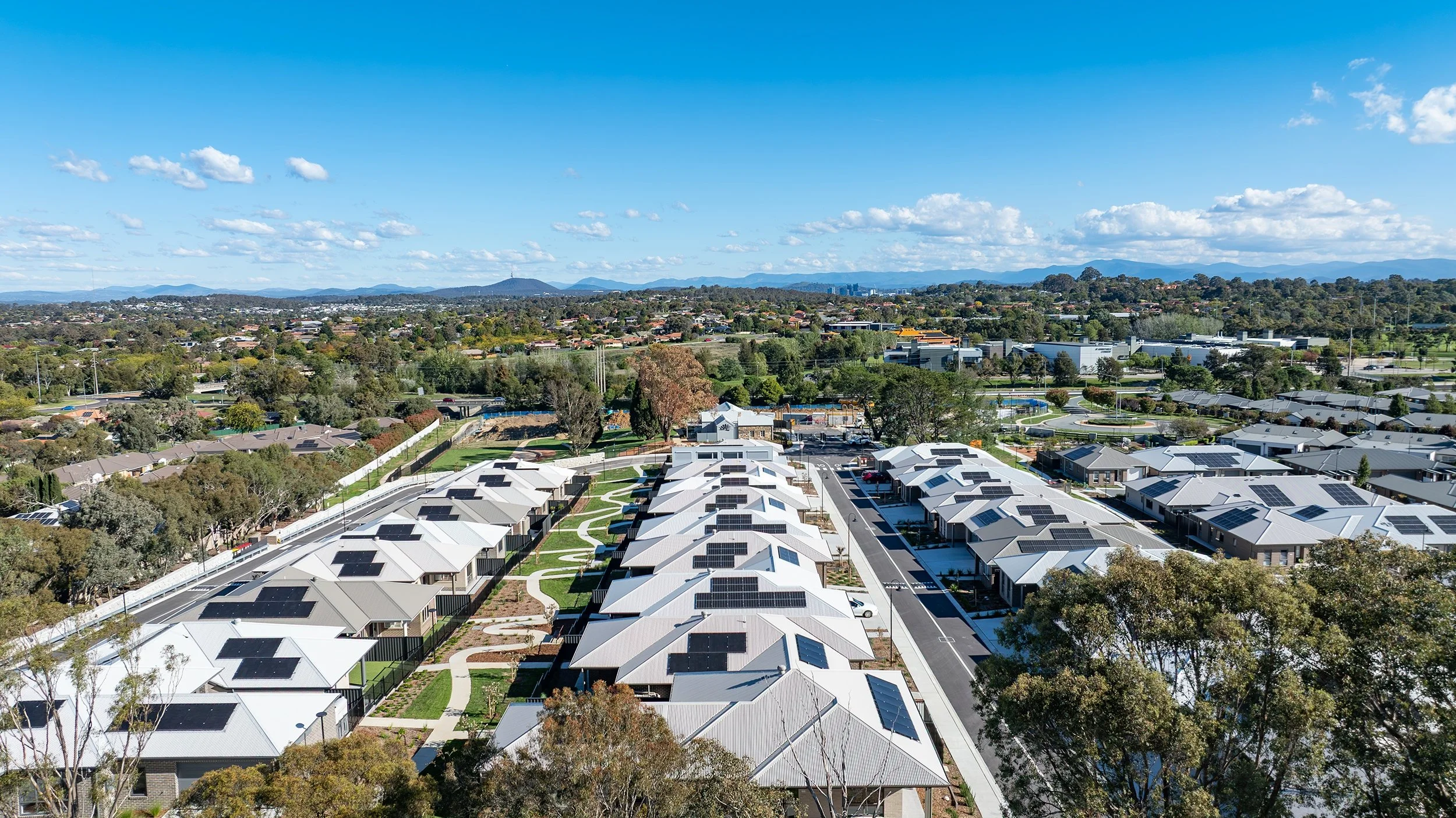 The Gold Creek Extension to The Grove in Ngunnawal is a 4.8-hectare retirement development delivering 45 new single-storey villas adjacent to the existing Grove retirement community. Each villa is designed as a Class C adaptable dwelling in accordance with the Liveable Housing Design Standard, featuring step-free entries, generous circulation spaces, and accessible bathrooms to support ageing in place.